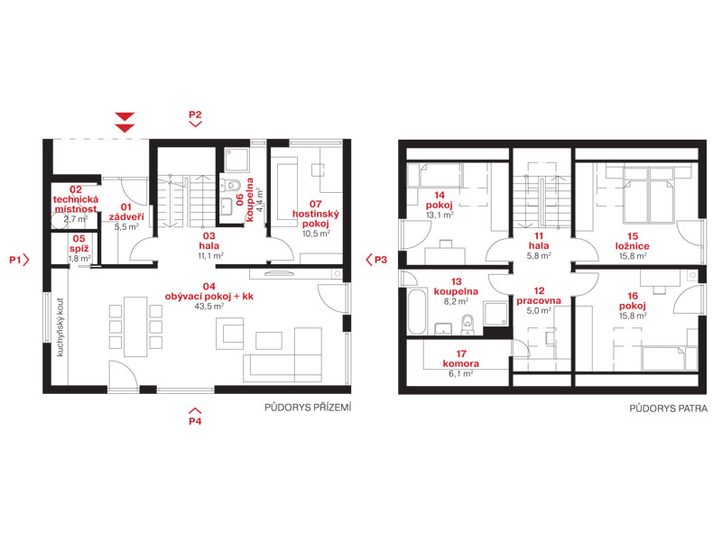 Nejprodávanější dům z typové nabídky je mezi klienty aktuálně jednoznačným favoritem. Vyznačuje se vzdušností, prosvětlením, moderním trendy vzhledem. V přízemí domu o dispozici 5+kk je obývací pokoj s velkými prosklenými plochami oken a vstupem přímo na terasu, schodiště a kuchyně s jídelnou, které vytvářejí jeden společný obytný prostor. Dále je zde technická místnost, spíž, koupelna s WC a hostinský pokoj. Podkroví je navrženo jako „soukromá část domu“, kde se nachází ložnice, dva další pokoje, koupelna s WC, komora a hala, která se dá využít jako pracovní kout. Moderní vzhled domu podtrhuje sedlová střecha bez přesahů. Chcete-li architektonicky zajímavý, moderní a finančně dosažitelný dům, není co řešit. Tento dům si navíc můžete prohlédnout předem, vzorový dům stojí v Šestajovicích.
