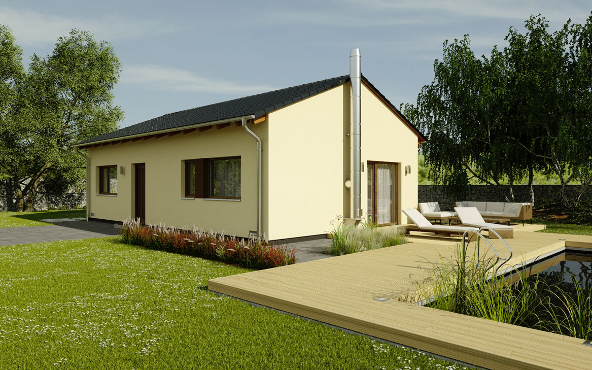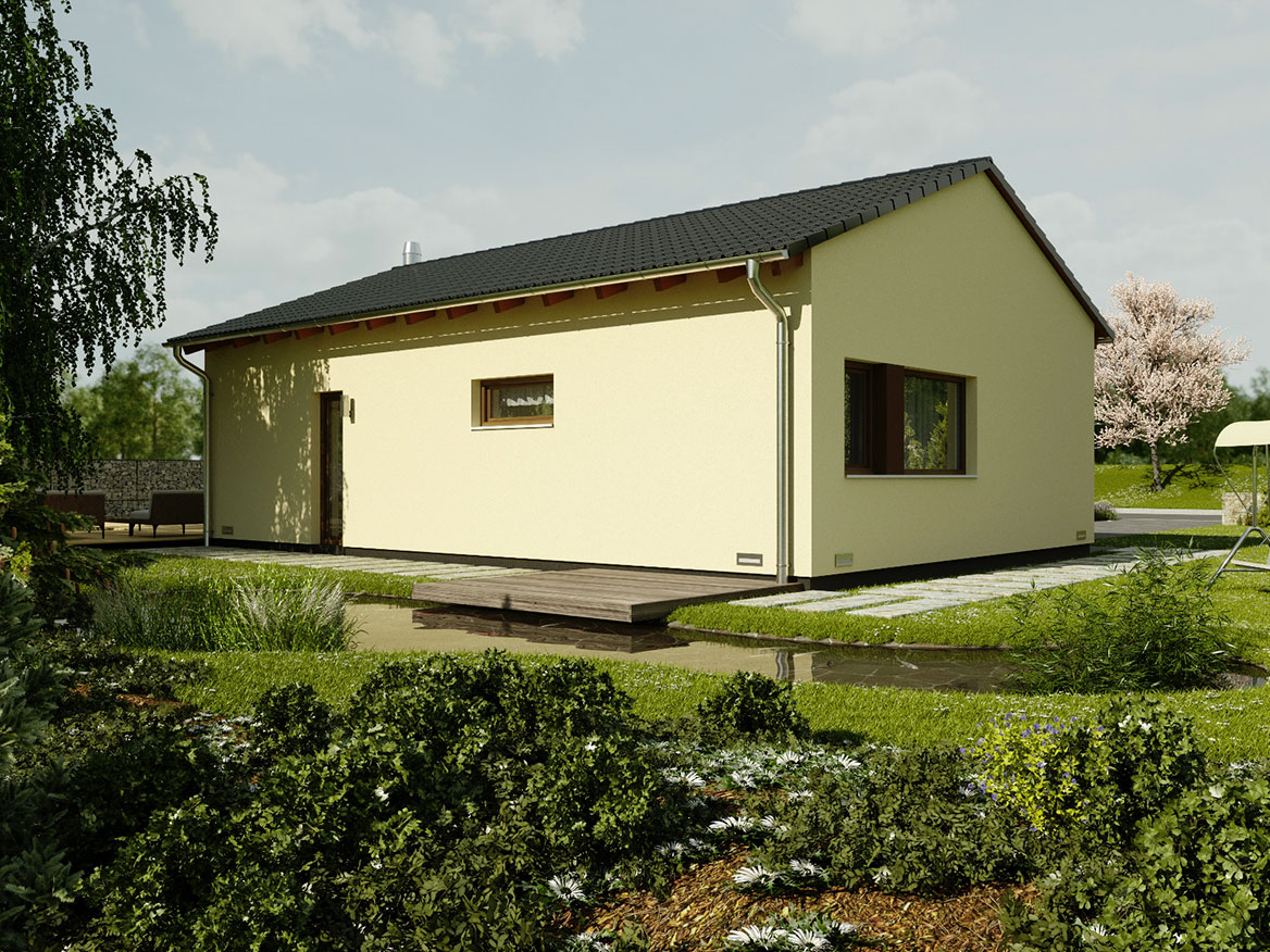 Moderní přízemní bungalov o dispozici 4+kk. Kvalitní dřevostavba o vnitřní podlahové ploše 74,6m2 umožní pohodlné bydlení i vícečlenné rodině. Do domu se vchází přes zádveří, přímo proti vstupu je vchod do chodby, ze které se dostanete do obývacího pokoje s kuchyňským koutem, koupelny, samostatného WC a dvou pokojů. Třetí pokoj je přístupný z obývacího pokoje, ve kterém prosklené francouzské okno umožňuje přímé propojení interiéru s exteriérem, tedy obývací místnosti se zahradou.