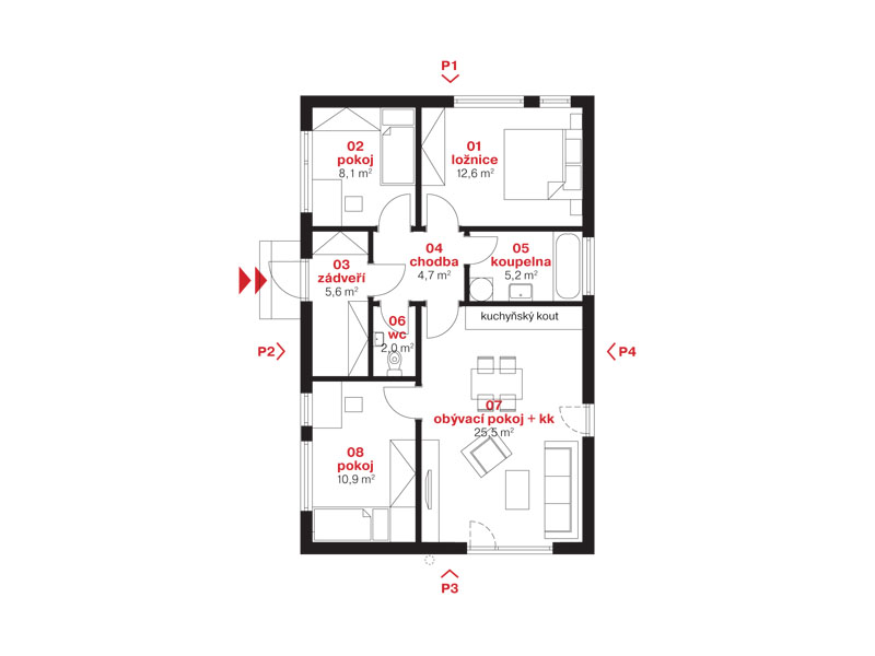Posunutí příčky, větší koupelna nebo více oken? Žádný problém! Rozvržení dispozice domu je ve vaší režii. Vstřícné řešení klientských změn je samozřejmostí.